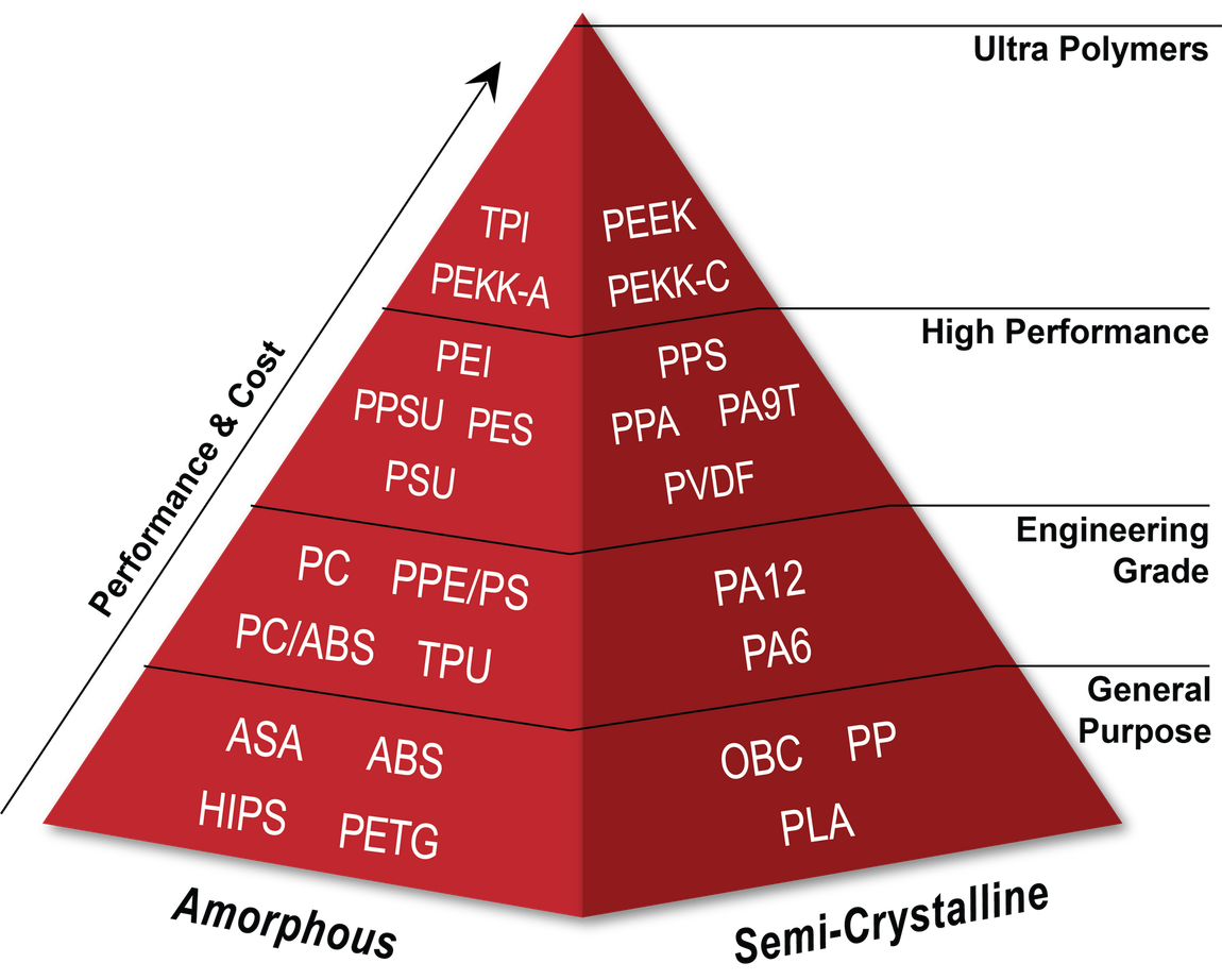 Polimeri tecnici ad elevate prestazioni: PEEK, PEEK-CF, PEEK-GF, PEI ULTEM, PPSU, PSS-CF, PVDF, PP, PA-CF, PA-GF, ABS ESD, ASA-CF