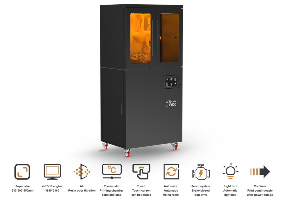 Stampante 3D industriale con tecnologia DLP ad alta risoluzione (4K), progettata per offrire precisione, affidabilità e produttività in una vasta gamma di applicazioni professionali.